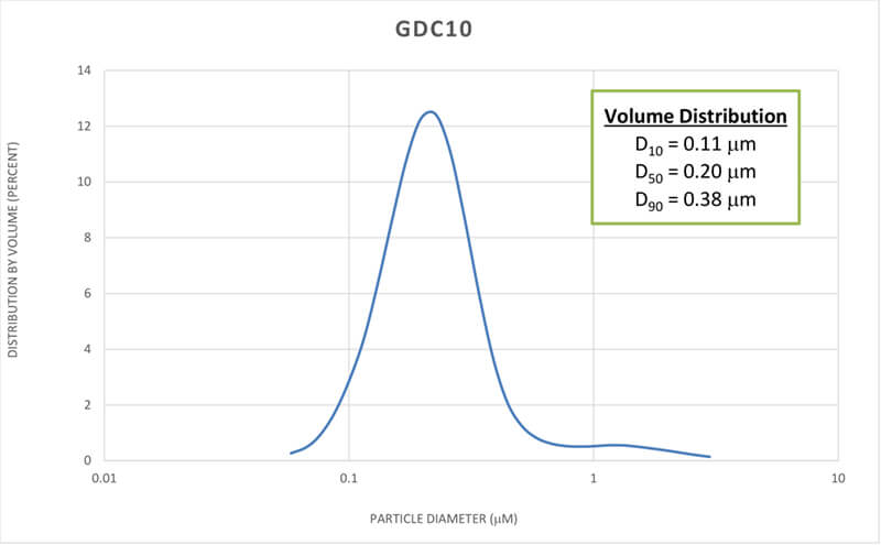 Nexceris’ Premium Powder line is designed to provide high performance membranes and coatings with wide processing flexibility. Our Gadolinium Doped Ceria 10% Gd – Premium Powder (GDC10) has been developed with higher surface area, finer particle size, and a narrower particle size distribution. These characteristics make it an excellent choice for enhancing triple-phase boundary areas in composite electrodes and barrier layers, reducing process temperatures, or increasing density of electrolyte membranes.